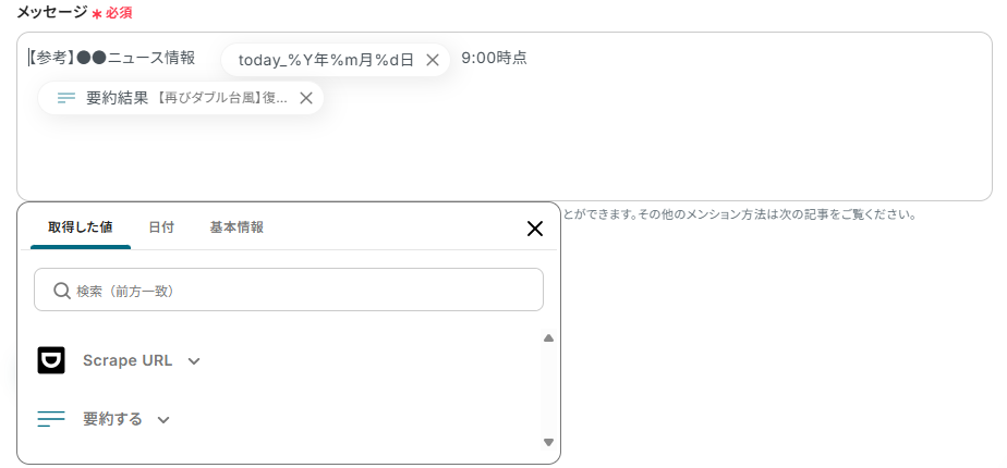 要約対象のテキストはフレーム内をクリックし、「取得した値」の「Scrape URL」より選択します。