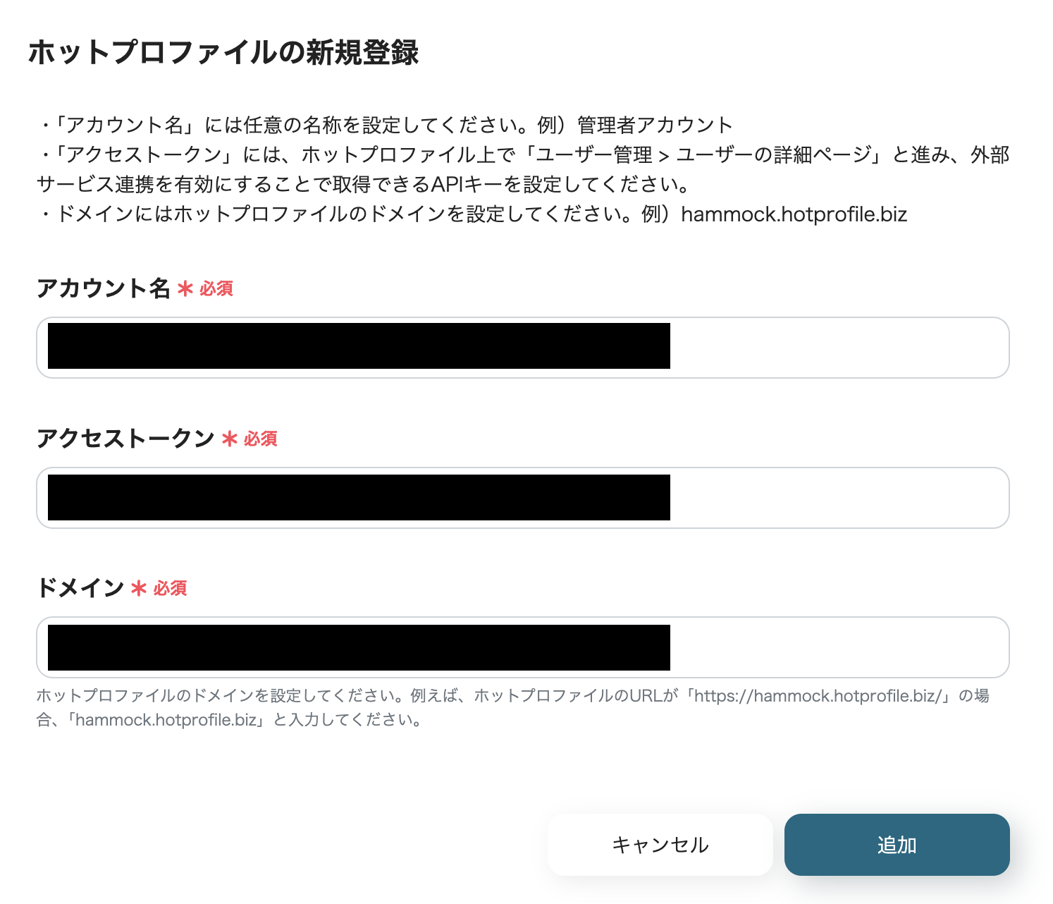 (4)連携させたいホットプロファイルの「アカウント名」と「アクセストークン」、「ドメイン」を入力します。