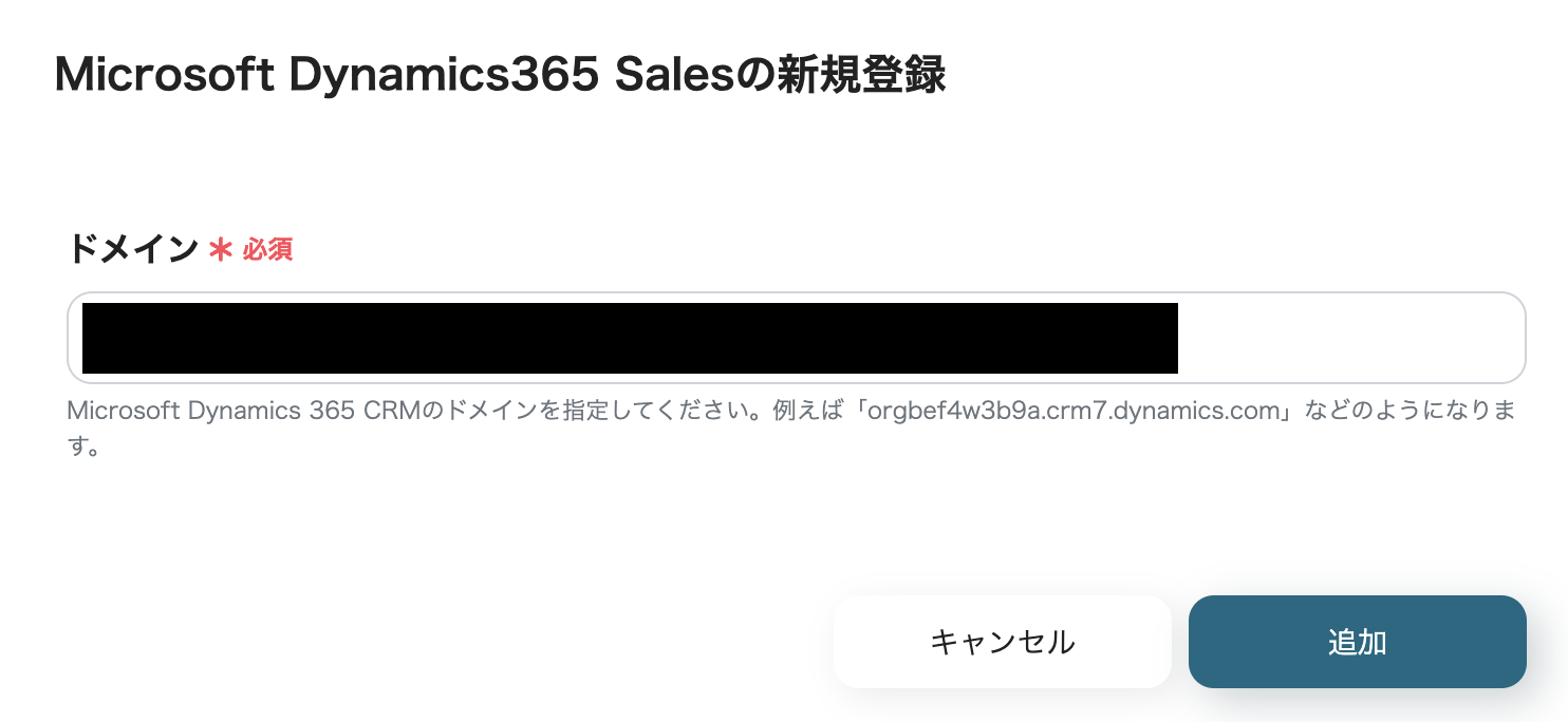 (2)連携させたいMicrosoft Dynamics365 Salesの「ドメイン」を入力し、[追加]をクリックしましょう。