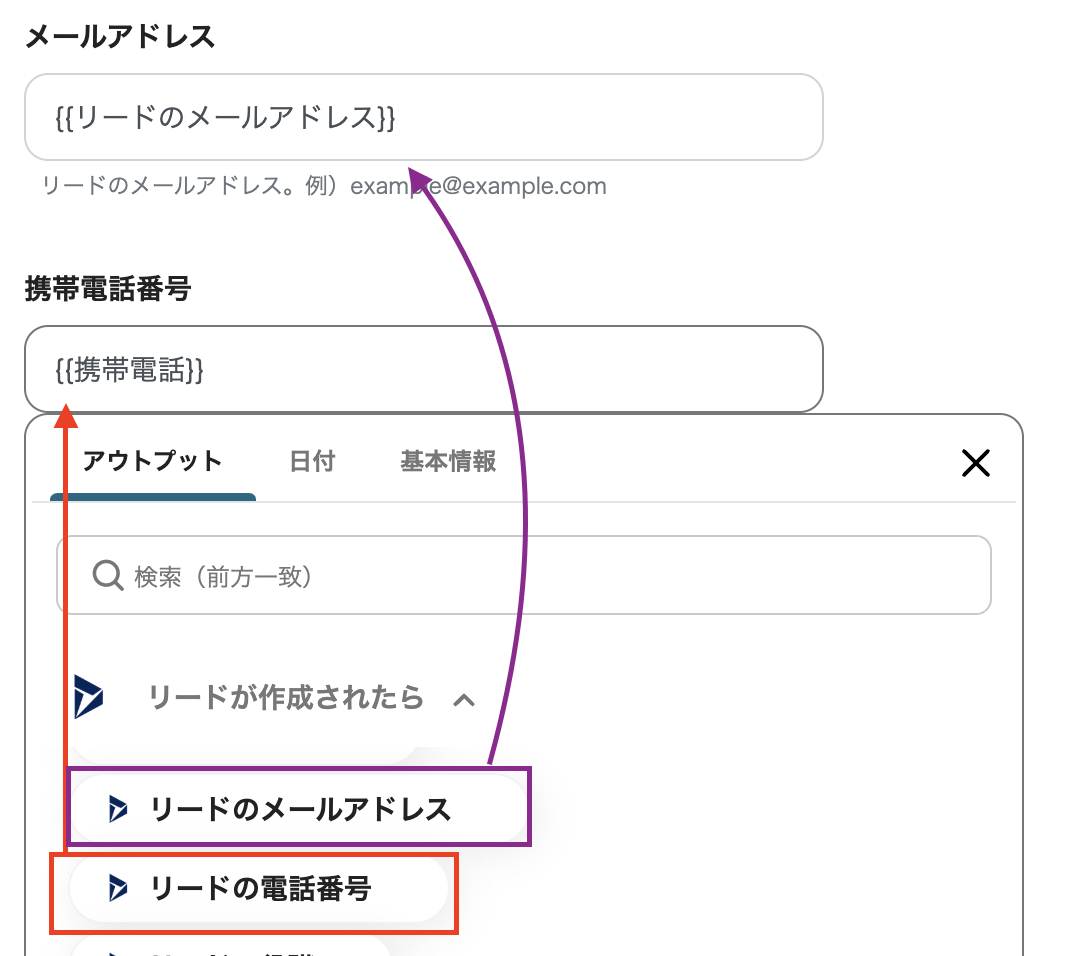 また、下記は前ステップから取得したアウトプット【メールアドレス】と【携帯電話番号】の情報を引用・設定したものです。