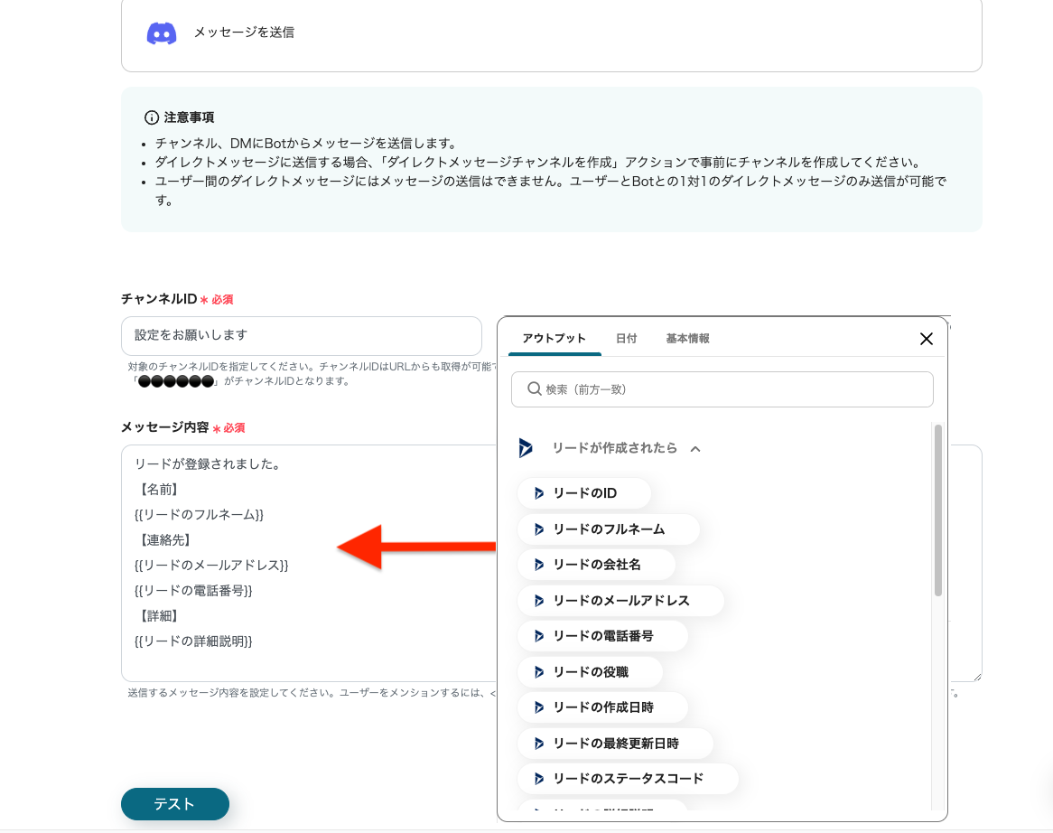 全ての設定が終わったら「テスト」をクリックし、Discrodの指定チャンネルにメッセージが送信されるか確認をしましょう。