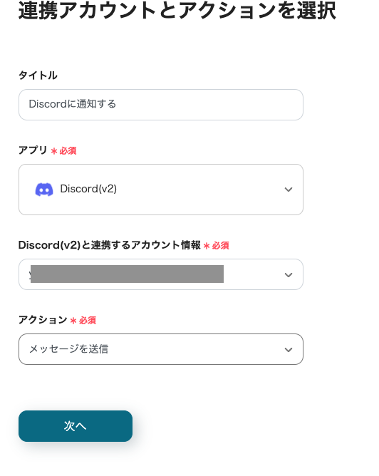 タイトルの任意編集とアカウント情報の確認を行い「次へ」をクリックしてください。