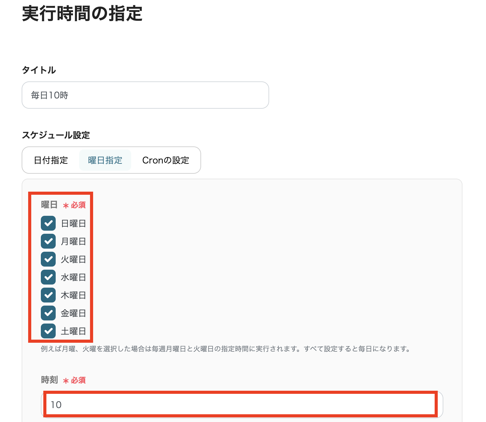 例)毎日10時に通知:全曜日にチェック、時刻欄に「10」と入力