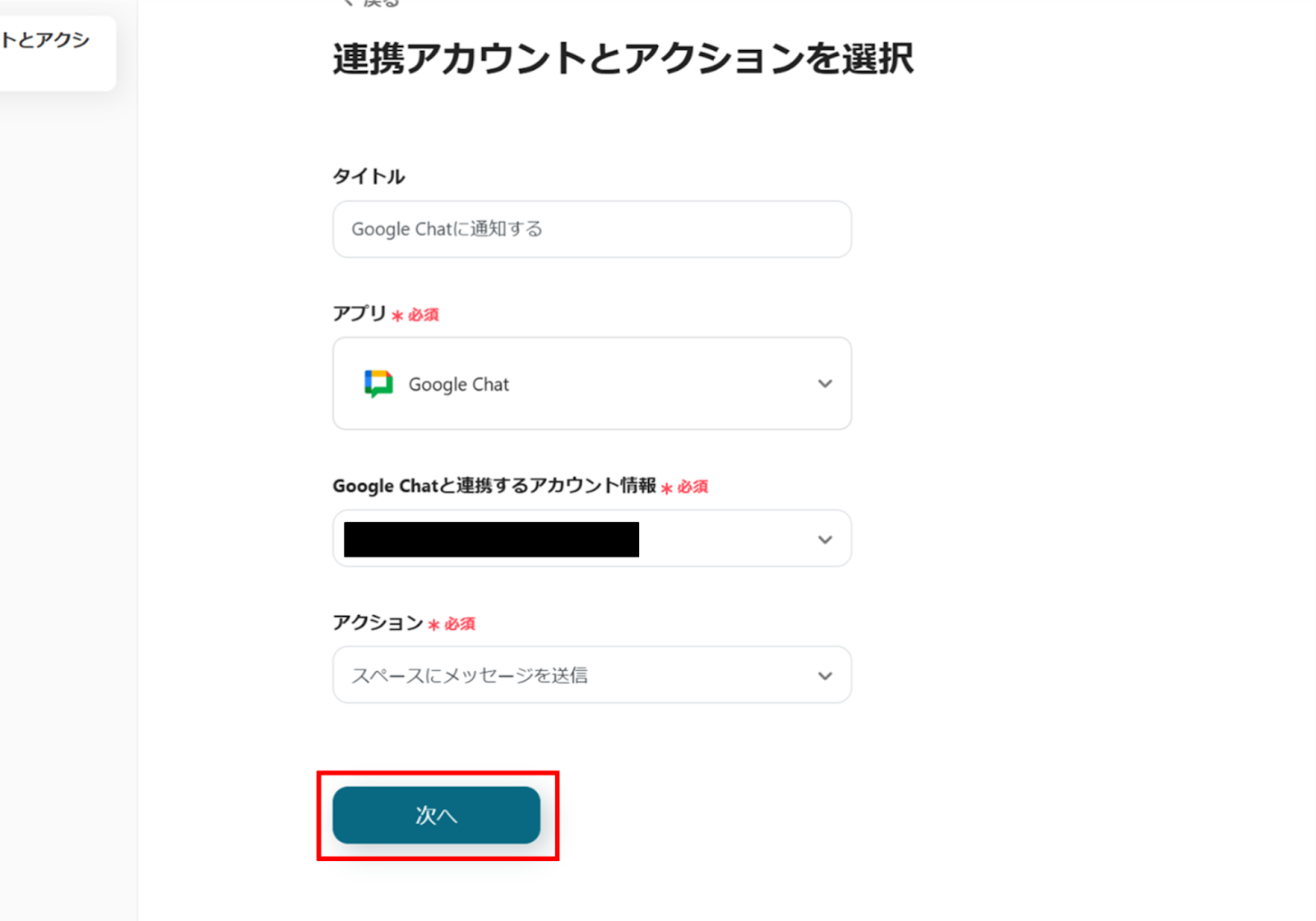(2)Google Chatの「連携アカウントとアクションを選択」画面から、Google Chatと連携するアカウント情報に誤りがないかを確認し、アクションは「スペースにメッセージを送信」のままで「次へ」をクリックします。