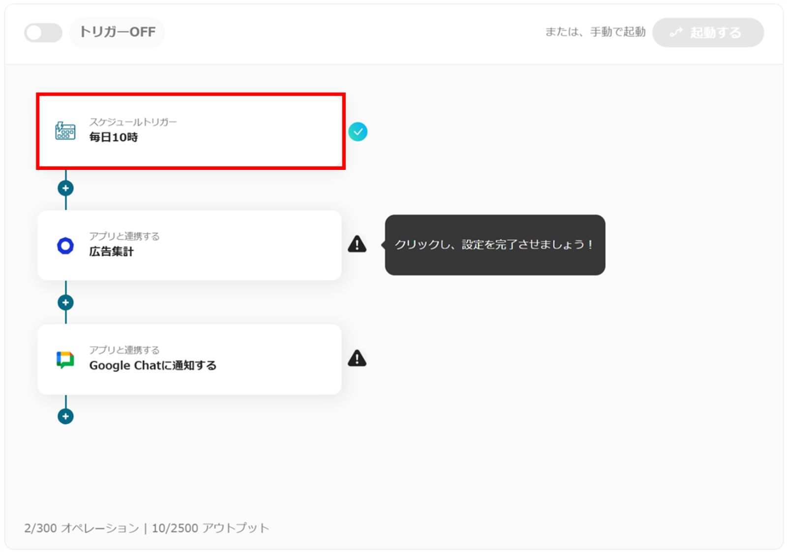 スケジュールトリガーの「毎日10時」をクリックします。