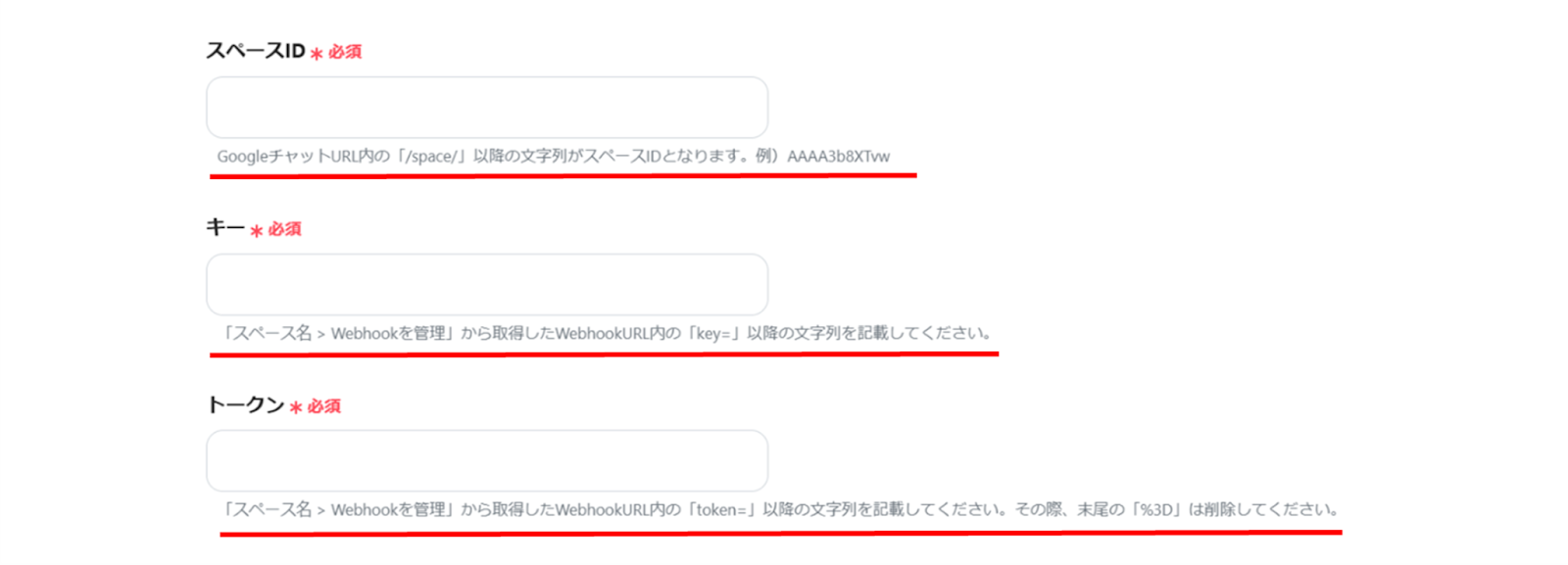 (3)「API接続設定」画面から、赤線を確認の上、スペースID、キー、トークンを入力します。