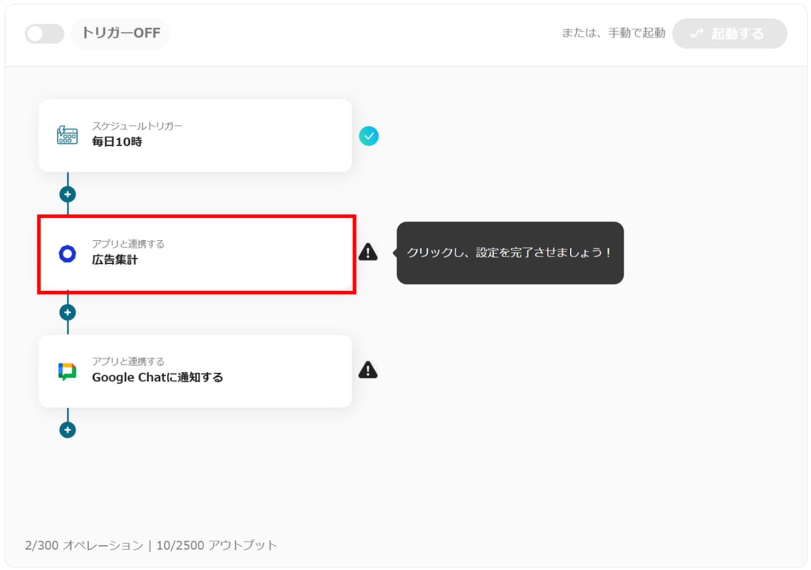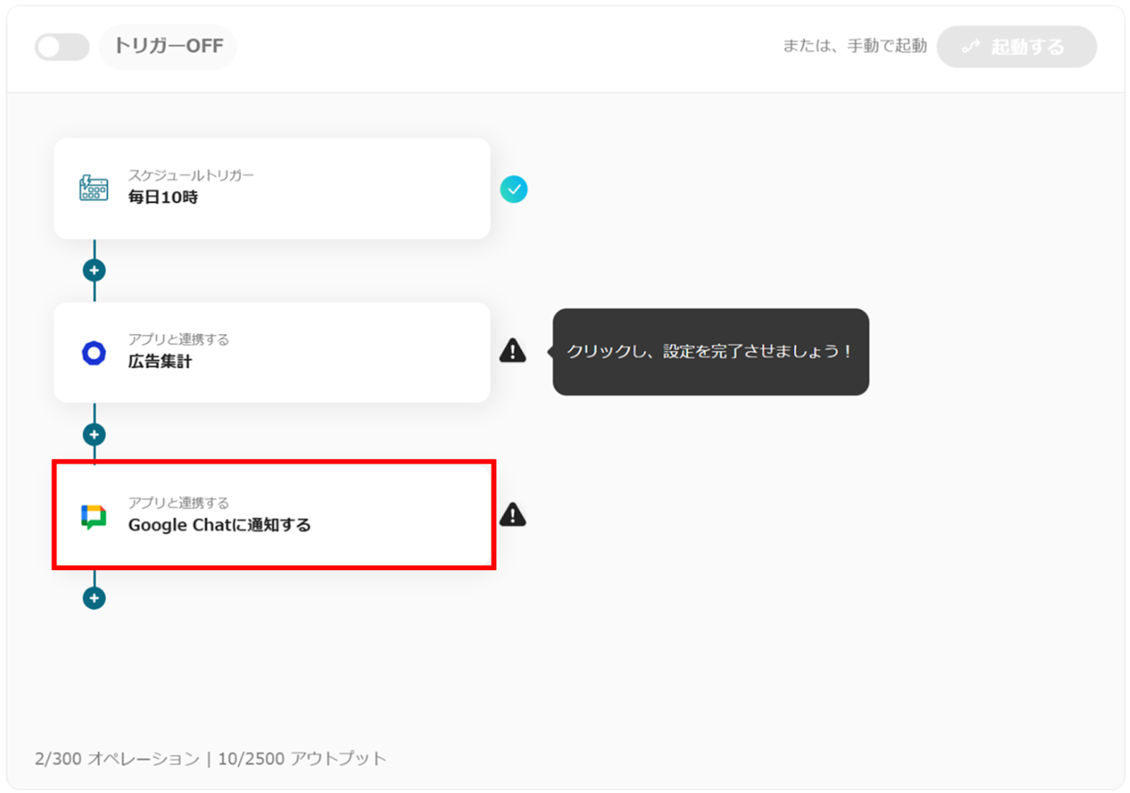 毎日指定の時間に前日のecforceから広告集計レポート情報を取得して、自動的にGoogle Chatに通知するフローです。