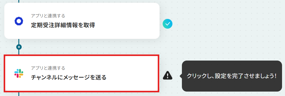 - 続いて、オペレーションでSlackを選択し、「チャンネルにメッセージを送る」アクションを設定することで、関係者に受注情報を通知します。