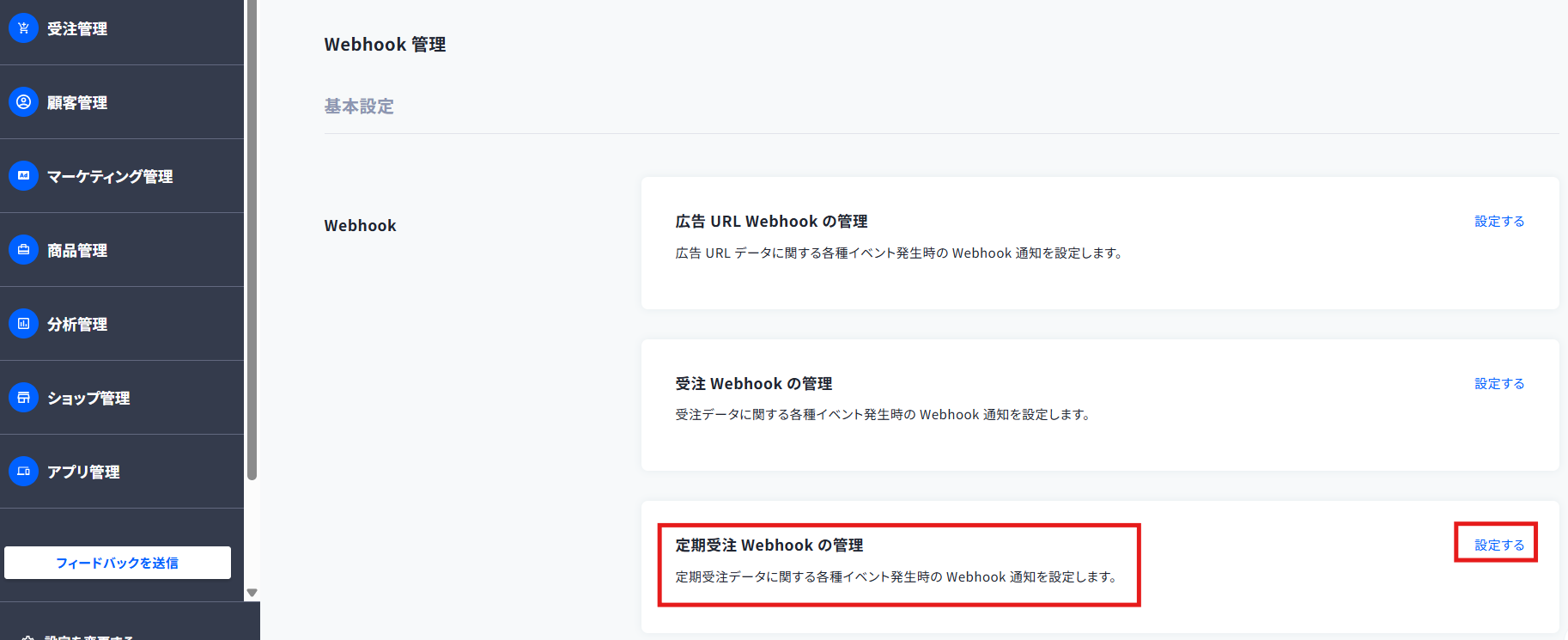 「定期受注Webhookの管理」の「設定する」をクリックしてください。