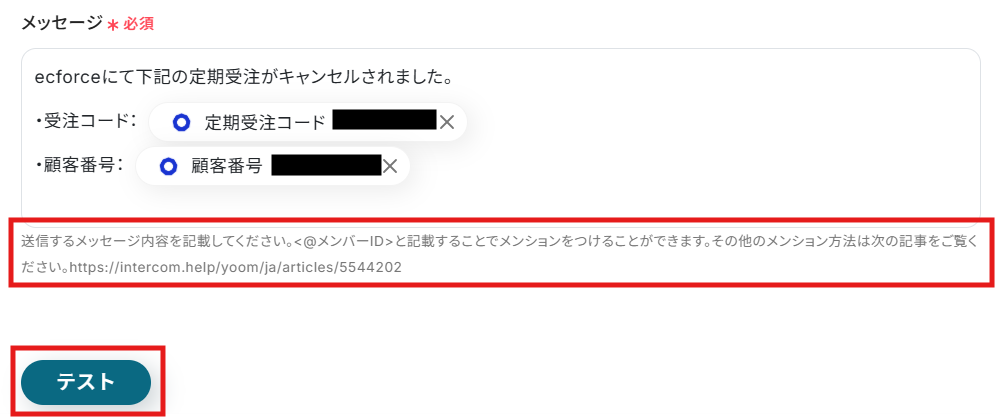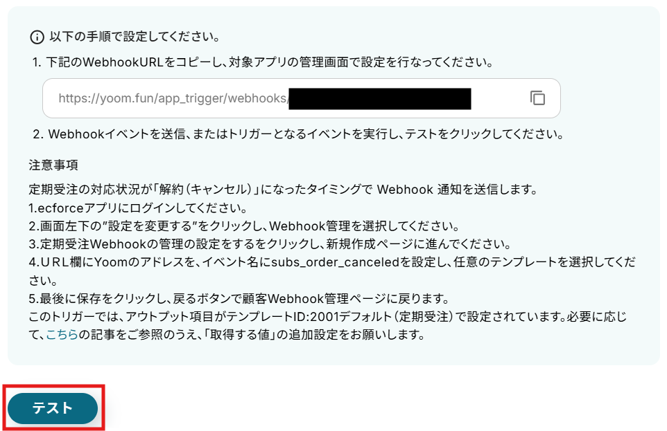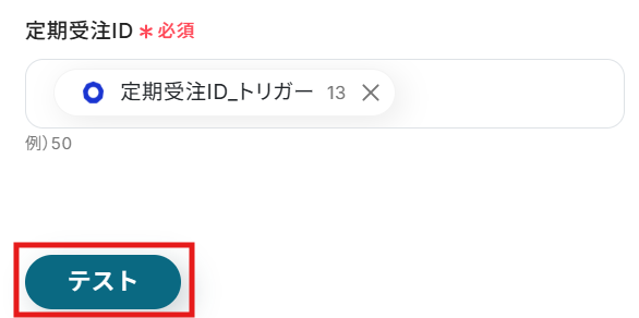 定期受注の解約処理が完了したら、Yoomの操作画面に戻り、「テスト」をクリックします。