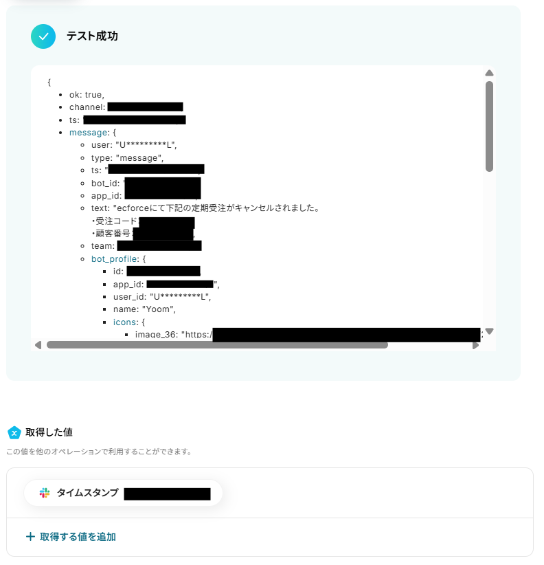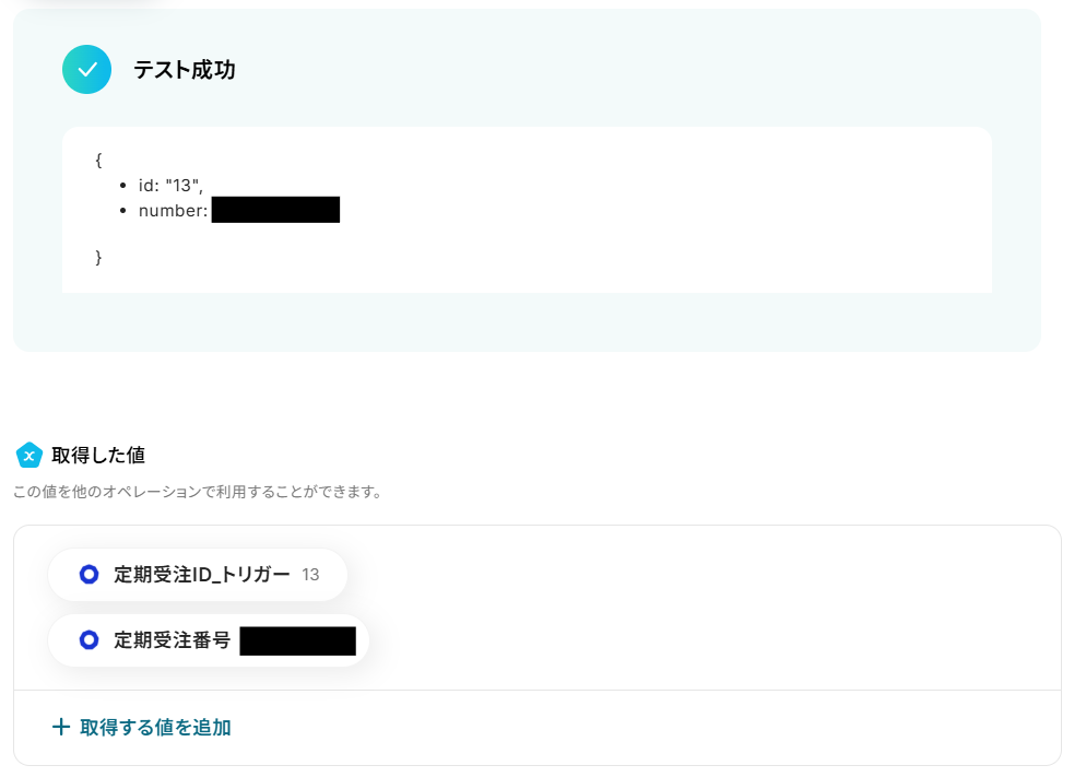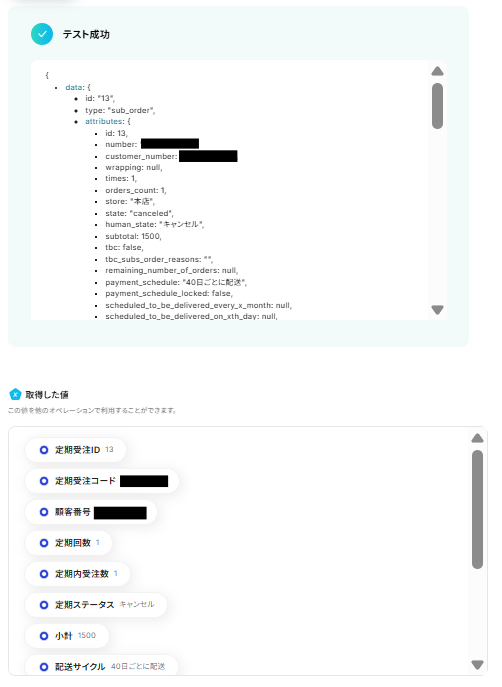 テストが成功すると取得した値の横に、ecforceで解約処理した定期受注の基本情報が表示されます。