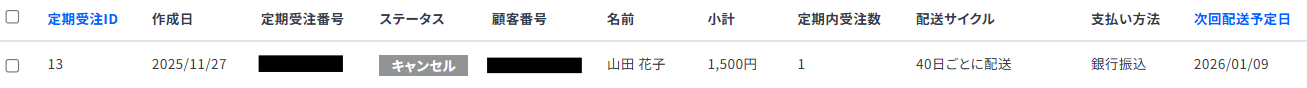 Webhookの情報を保存したら、次にテスト可能な顧客に定期受注を作成し、解約処理を行ってください。