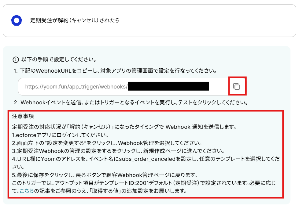 まずecforceのトリガーアクションをYoomと連携するために、ecforceにWebhookを設定します。
