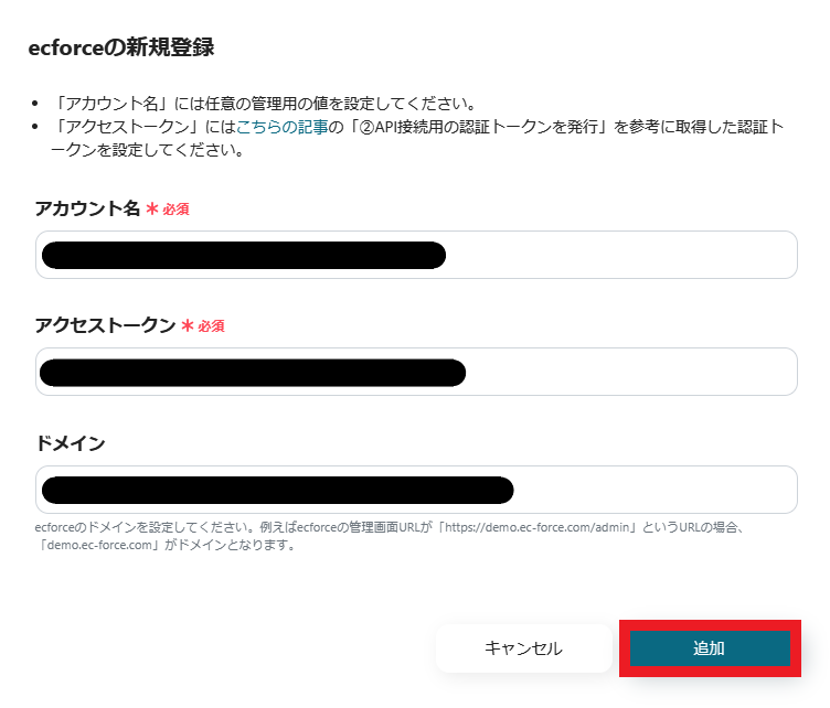 1.アカウント名、アクセストークン、アクセスキーを入力してください。