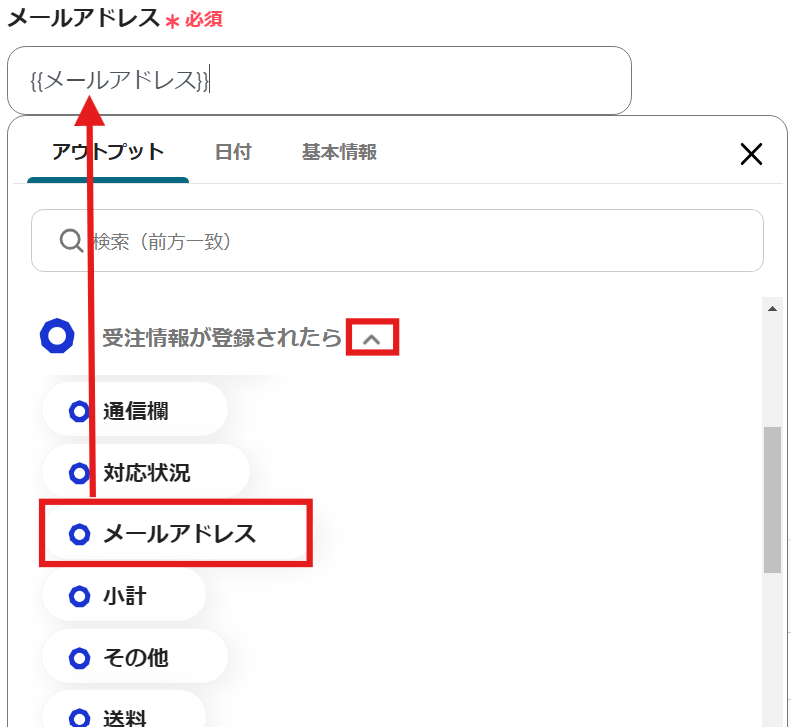 ecforceのアウトプットを使用して、「メールアドレス」を選択します。