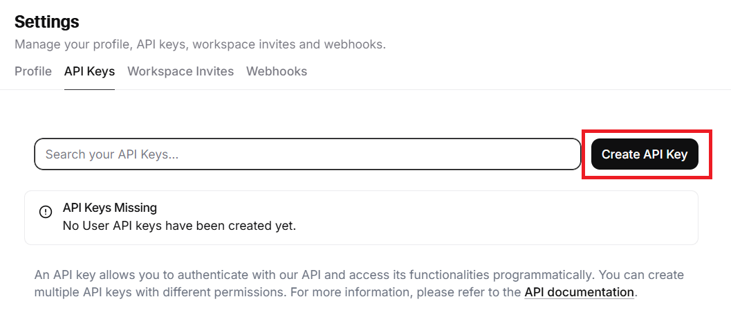 設定画面に入ったら、「Create API Key」をクリックしてAPIキーの発行を行います。