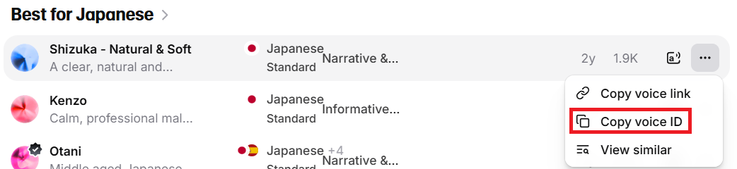 選択肢が表示されます。「Copy Voice ID」をクリックして、目的の音声のIDをクリップボードにコピーしておきましょう。