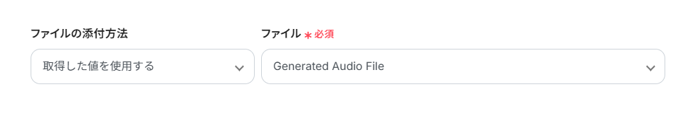 ファイルの添付方法には、「取得した値を使用する」を選びましょう。ファイルには前のステップで取得した、ElevenLabsで音声化したデータが反映されています。