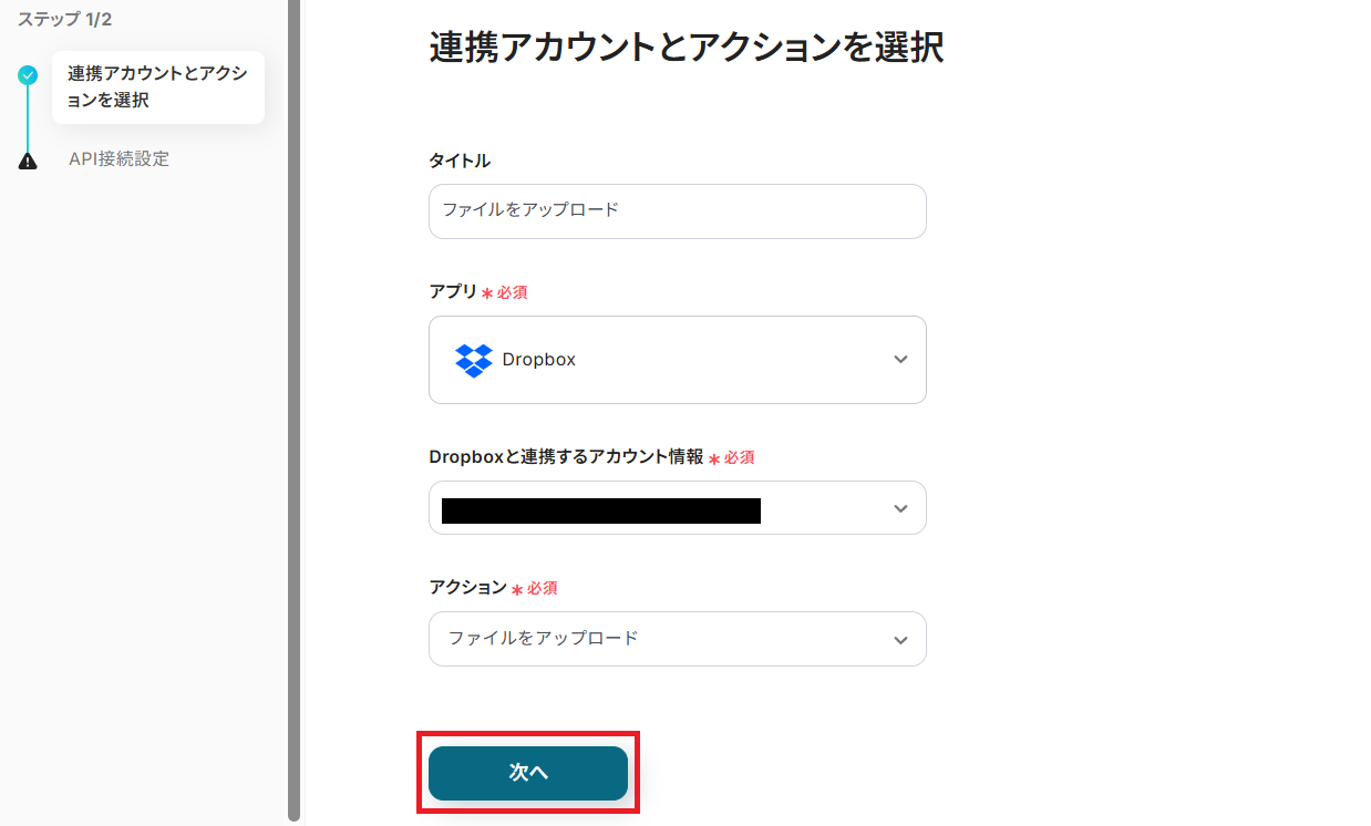 タイトルは必要に応じて設定してください。Dropboxと連携しているアカウントに間違いがないのを確認したら、「次へ」ボタンで進みましょう。