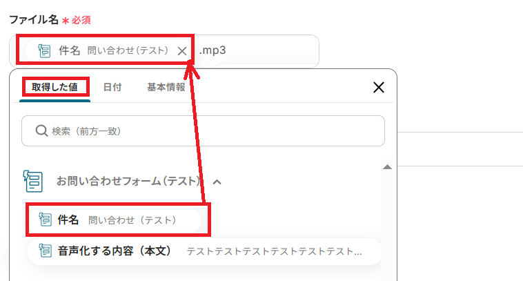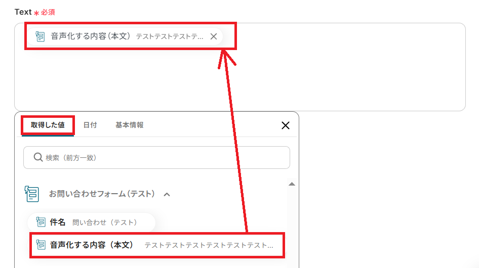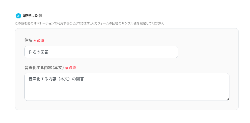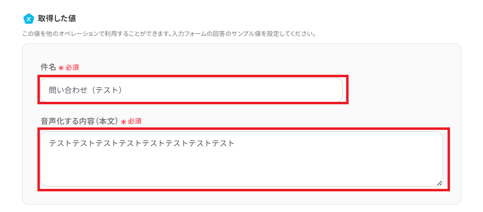 以下のように「取得した値」として、実際にフォームから回答された場合に送られてくる「件名」や「音声化する内容(本文)」が表示されています。