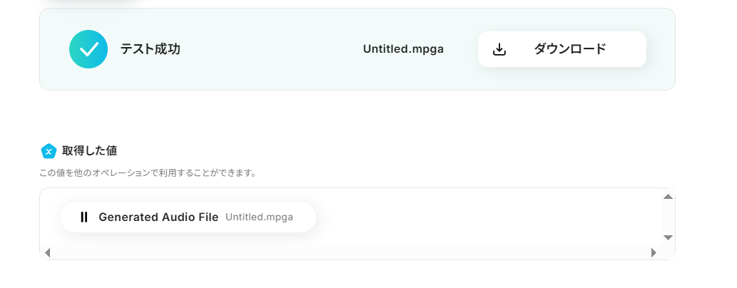 以下のように、ElevenLabsで生成した音声ファイルがテスト結果や取得した値に反映されていれば成功です!「保存する」ボタンを押しましょう。