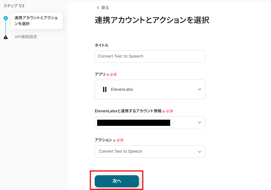 アクション設定画面では、タイトルを任意で変更できます。アプリがElevenLabsになっていることや、連携アカウントが間違っていないことを確認したら「次へ」をクリックしてください。