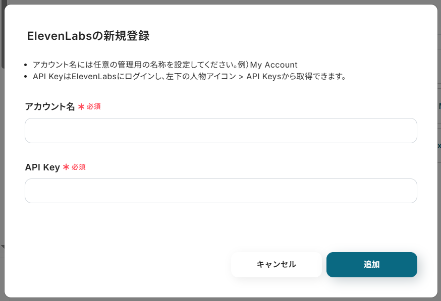 ElevenLabsの新規登録画面が表示されます。「アカウント名」にはElevenLabsに登録した際のメールアドレスを、「API Key」にはこれから発行するAPIキーを入力します。