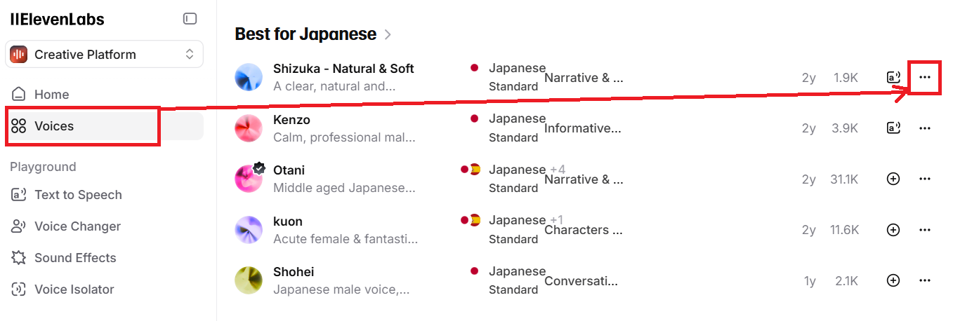 一度ElevenLabsにログインして、左側にある「Voices」をクリックし、右に表示される音声候補から1つを選びましょう。