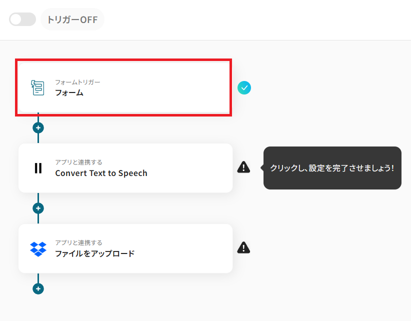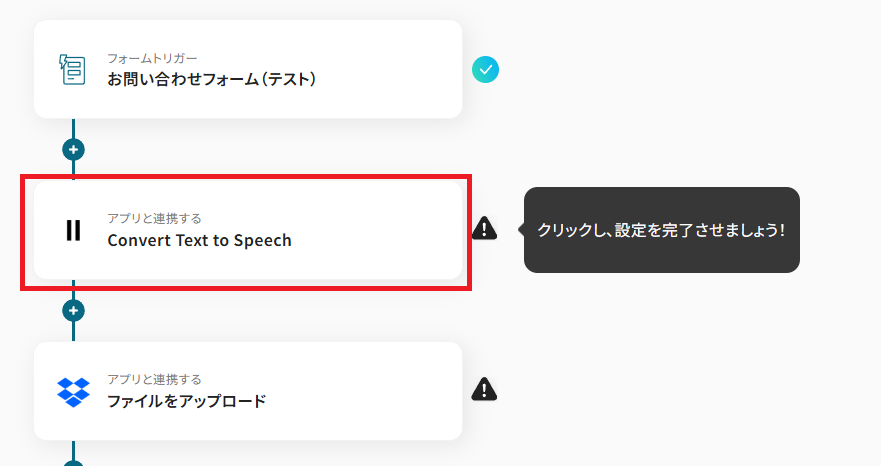 前ステップで作成したフォームから送られてきた内容を、ElevenLabsで音声化するアクションを設定します。
