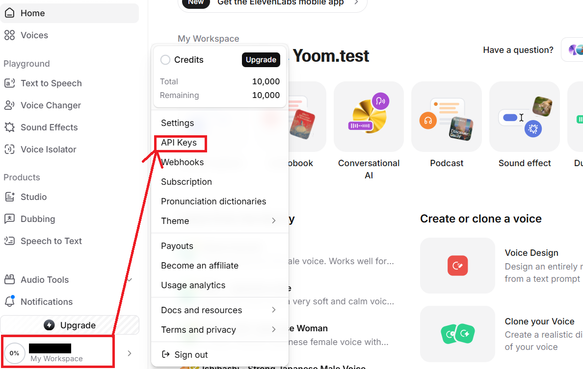 まずElevenLabsにログインして、左下にある「My Workspace」から「API Keys」をクリックしましょう。