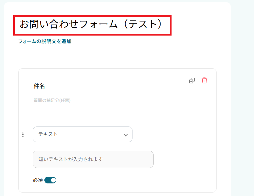 まずは赤枠部分の文字をテスト用のフォームの名前に変更してみてください。ここでは例として、「お問い合わせフォーム(テスト)」と入力しています。