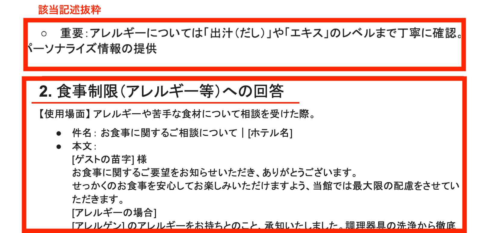 アレルギーに関する文章についても、マニュアル内の「アレルギー対応項目」を参照して、誤のない文章を生成しています!