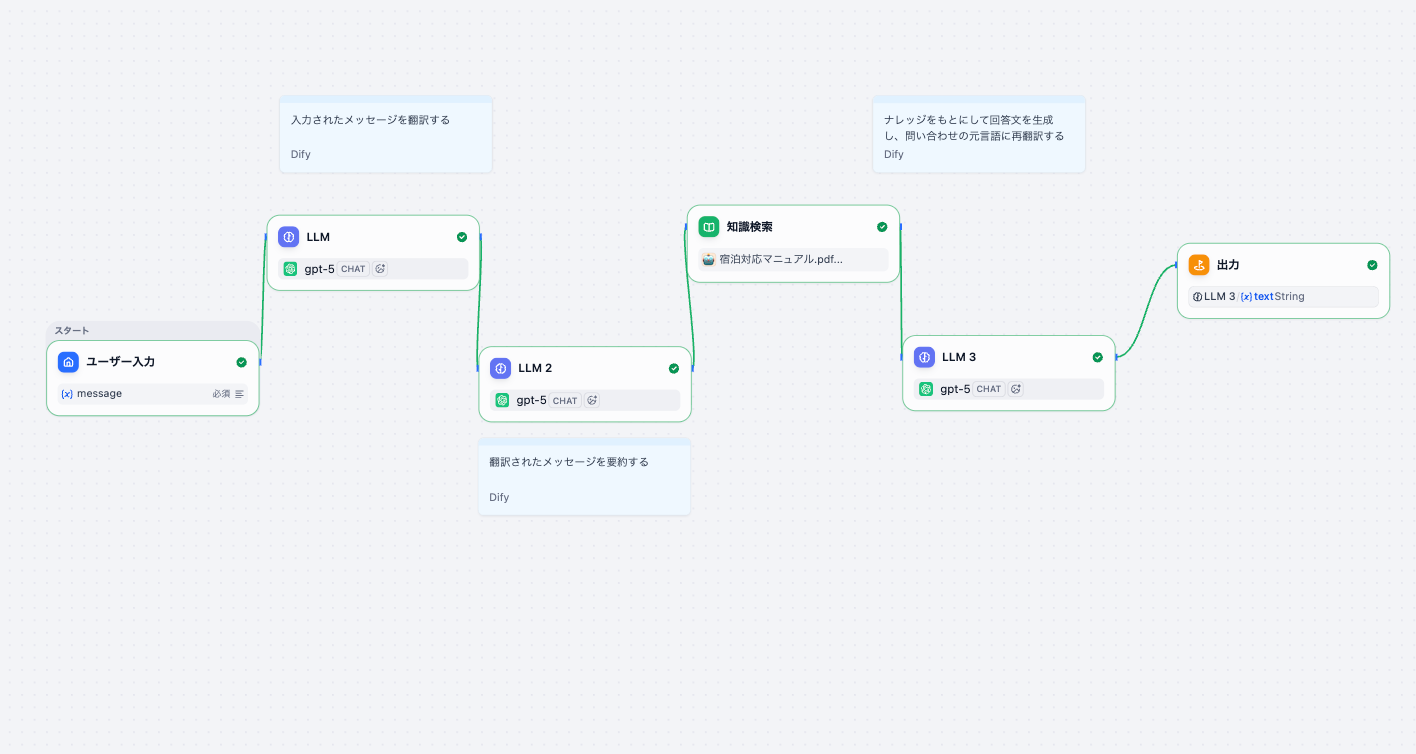 まずは、複数のLLMを選択してワークフローに組み込める強みを活かし、インバウンド対応が必要なホテル・観光業スタッフが使用する多言語CSアプリを作成してみます!