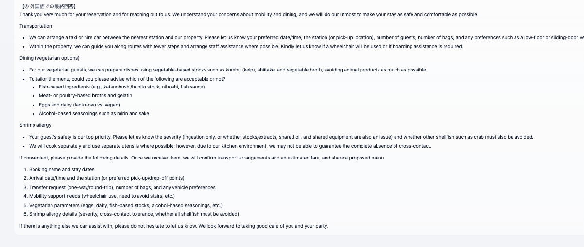 問い合わせの原文に記載されていない情報(送迎の詳細や乳製品や卵の可否、魚介だしの可否といった連絡事項の提供)もありますが、AIが補完したものと推察します。