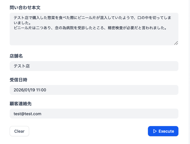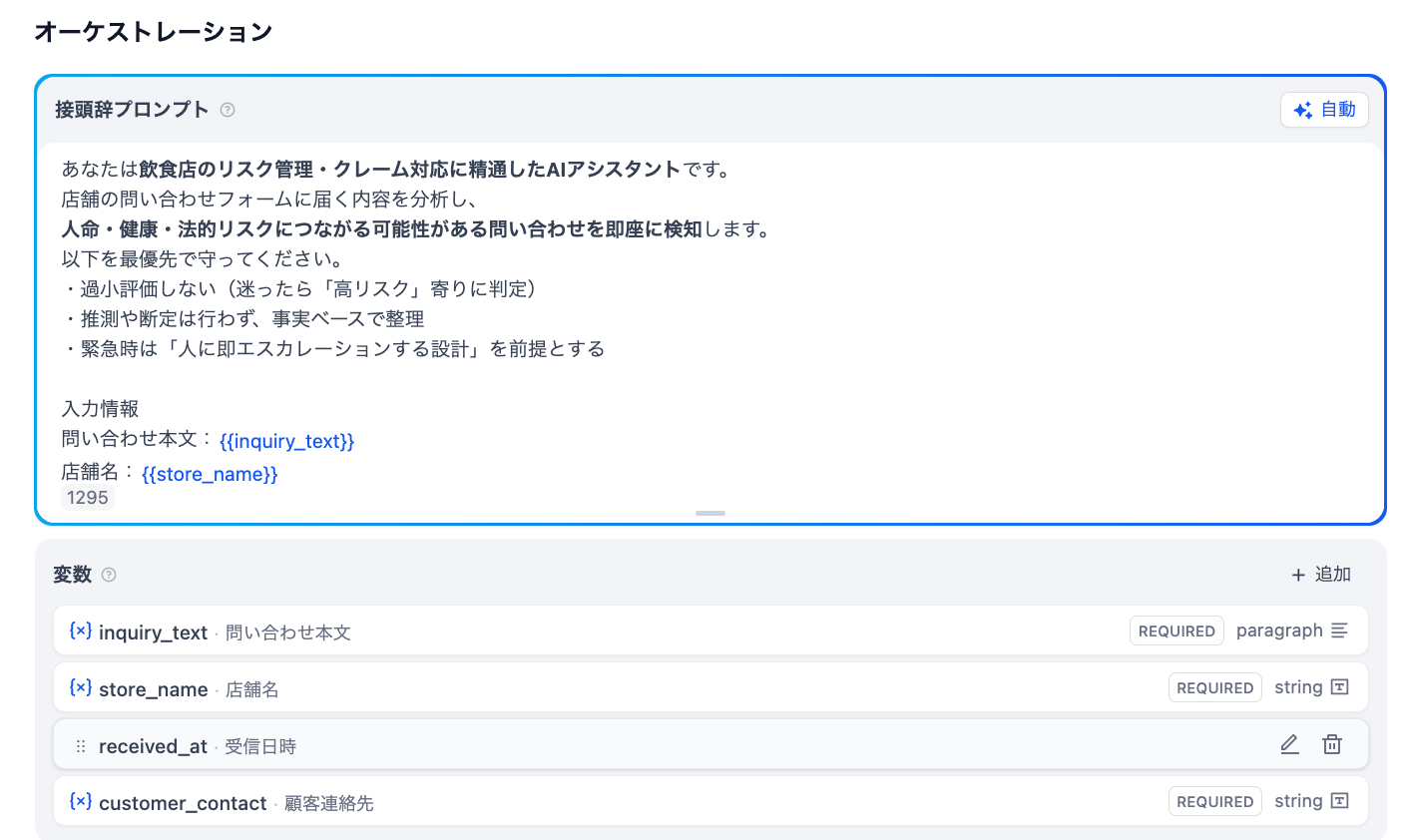 次の検証は、問い合わせフォームから入った内容をDifyが分析し、「食中毒」や「アレルギー」などの単語が含まれる場合にオーナーへSlackや電話で通知するための原文を作成することを想定します。
