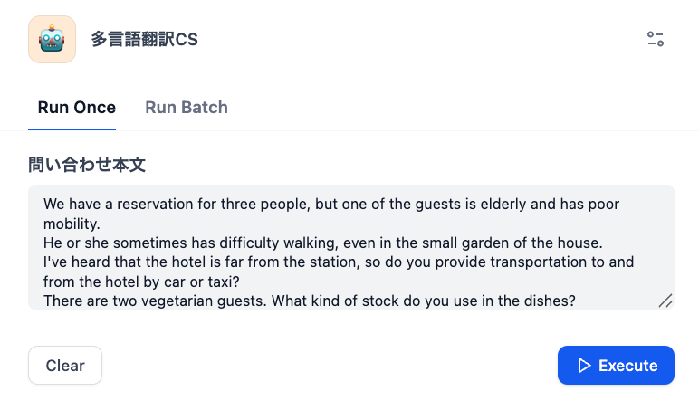 さまざまな言語の文脈を理解、その後日本語に翻訳し、日本語での回答を再度翻訳して返信するというプロセスをスムーズに処理できるかをジャッジしていきましょう。
