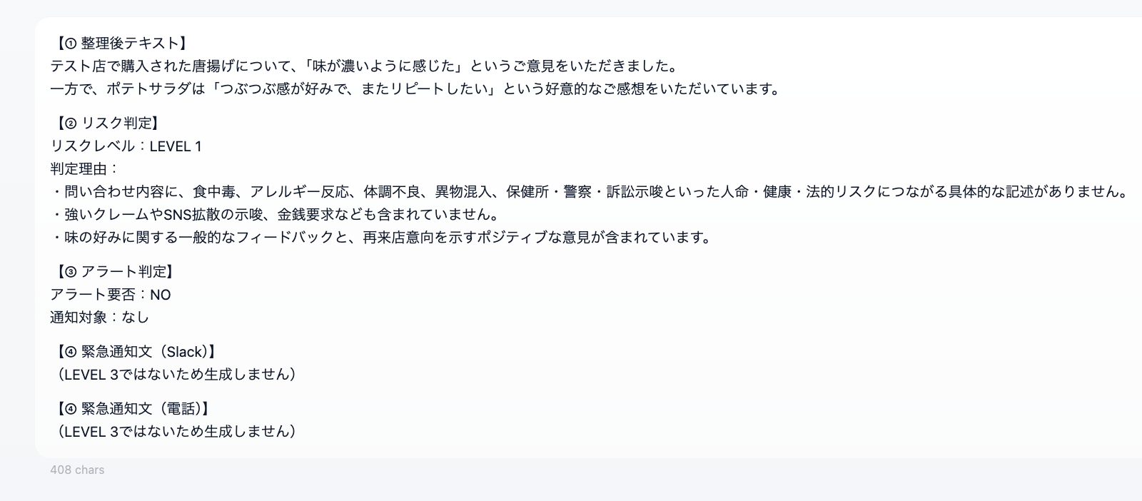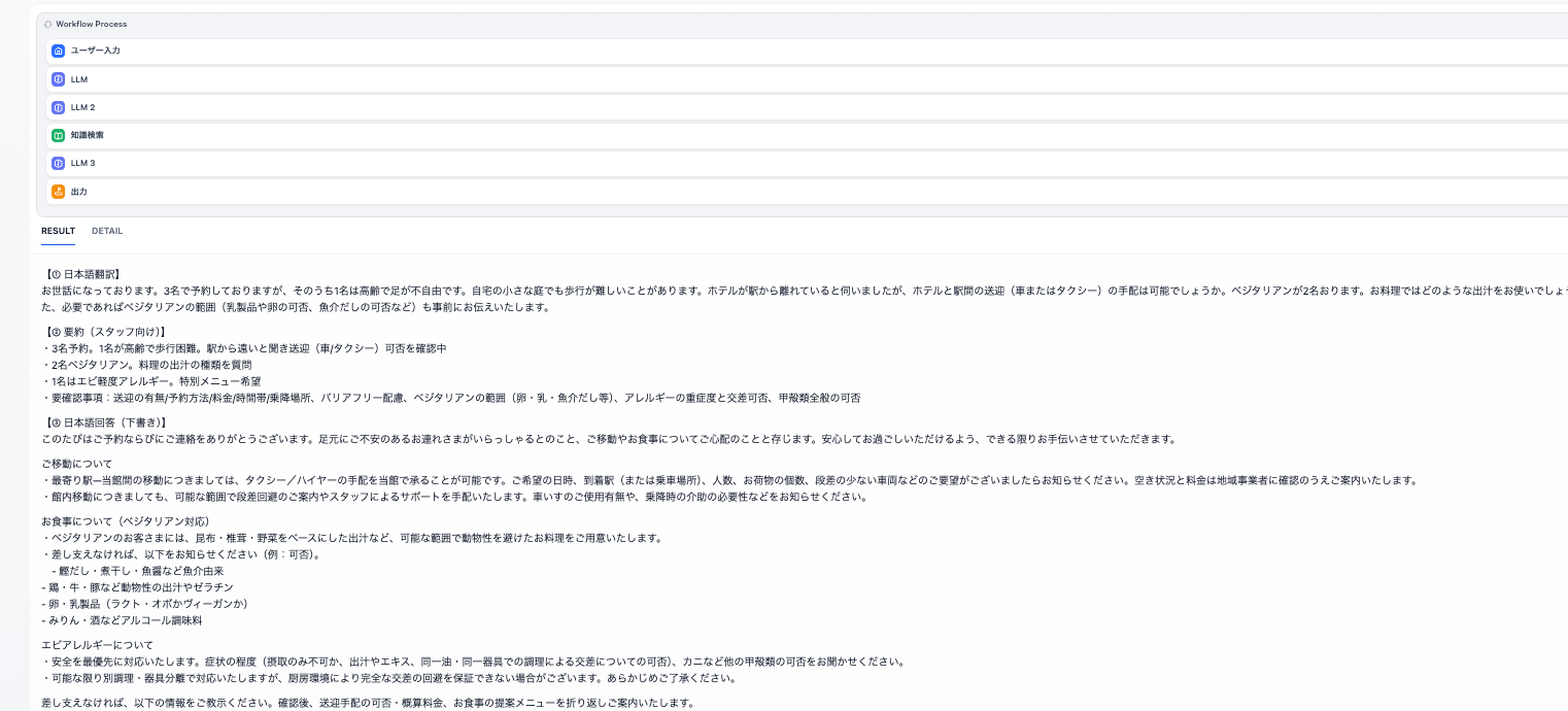 【① 日本語翻訳】【② 要約(スタッフ向け)】【③ 日本語回答(下書き)】【④ 外国語での最終回答】の形式で出力するように指示していましたが、正しく出力できているようです!