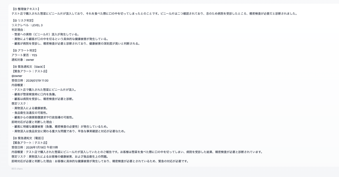 また、オーナーへの報告として、【Slack通知文】【読み上げスタイルの電話報告文】を設定した形式で抽出できています!