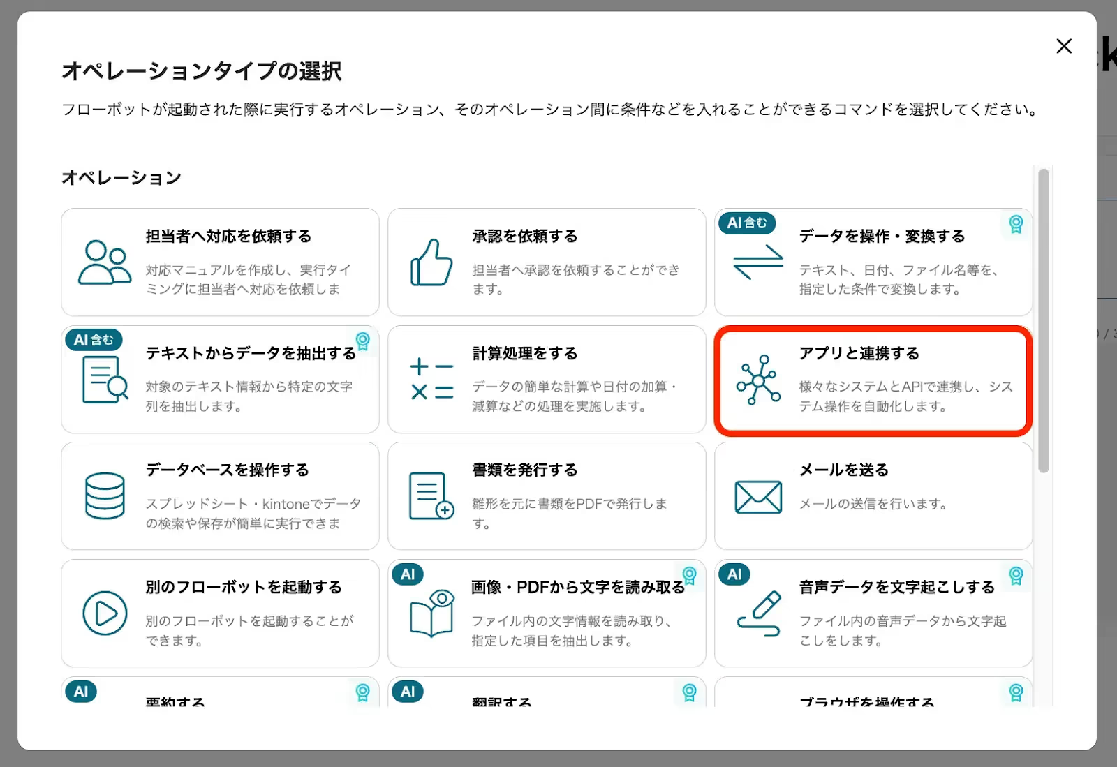 2.オペレーションの中から「アプリと連携する」を選択しましょう。