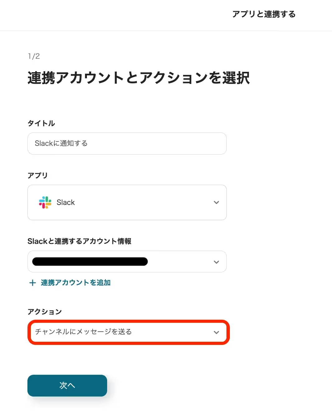 5.アクションは「チャンネルにメッセージを送る」を選択してください。 6.ここまで設定できたら次へをクリックしましょう。