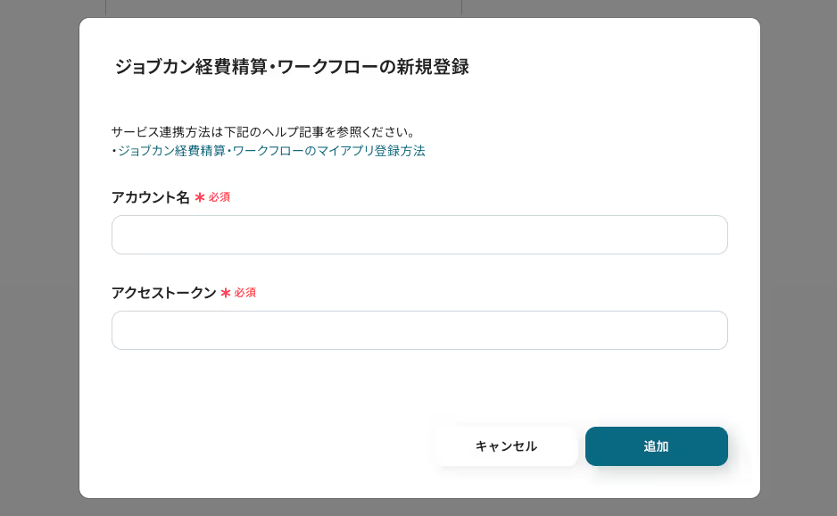 ジョブカン経費精算・ワークフローのマイアプリ連携 1.マイアプリの新規接続一覧の中から、ジョブカン経費精算・ワークフローを選択します。 2.下記の画面が表示されるので、「アカウント名」と「アクセストークン」を入力し、[追加]をクリックしてください。 ※参考:ジョブカン経費精算・ワークフローのマイアプリ登録方法