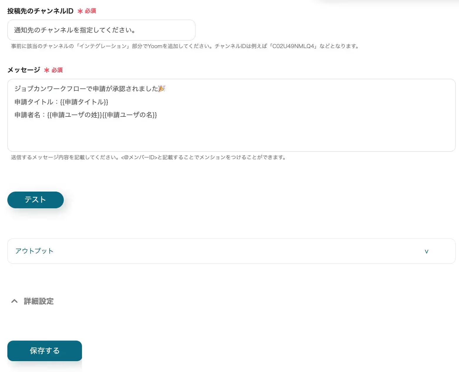 8.「メッセージ」は、通知したい内容を入力していきます。 アウトプット(取得した値)を引用することで、毎回異なる内容を通知できます。 なお、アウトプット(取得した値)を引用せず固定値を入力してしまうと、毎回同じ内容が通知されるのでご注意ください。 今回は、申請が承認されたことが分かるテキストと、申請者情報が分かるように{{申請タイトル}}、{{申請ユーザの姓}}、{{申請ユーザの名}}をそれぞれアウトプット(取得した値)を引用し配置しました。