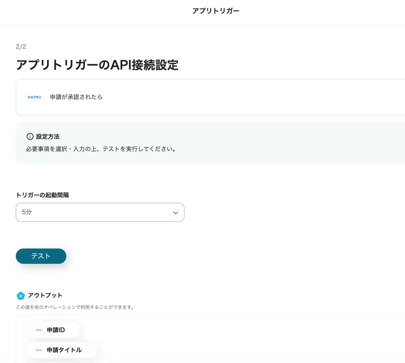 次の画面ではアプリトリガーのAPI接続設定を行います。 10.トリガーの起動時間は5分に設定します。 ※ご利用プラン によって設定できる起動間隔が異なります。 11.ジョブカン経費精算・ワークフローで実際に申請を承認し、フローに戻ったらテストをクリックしましょう。