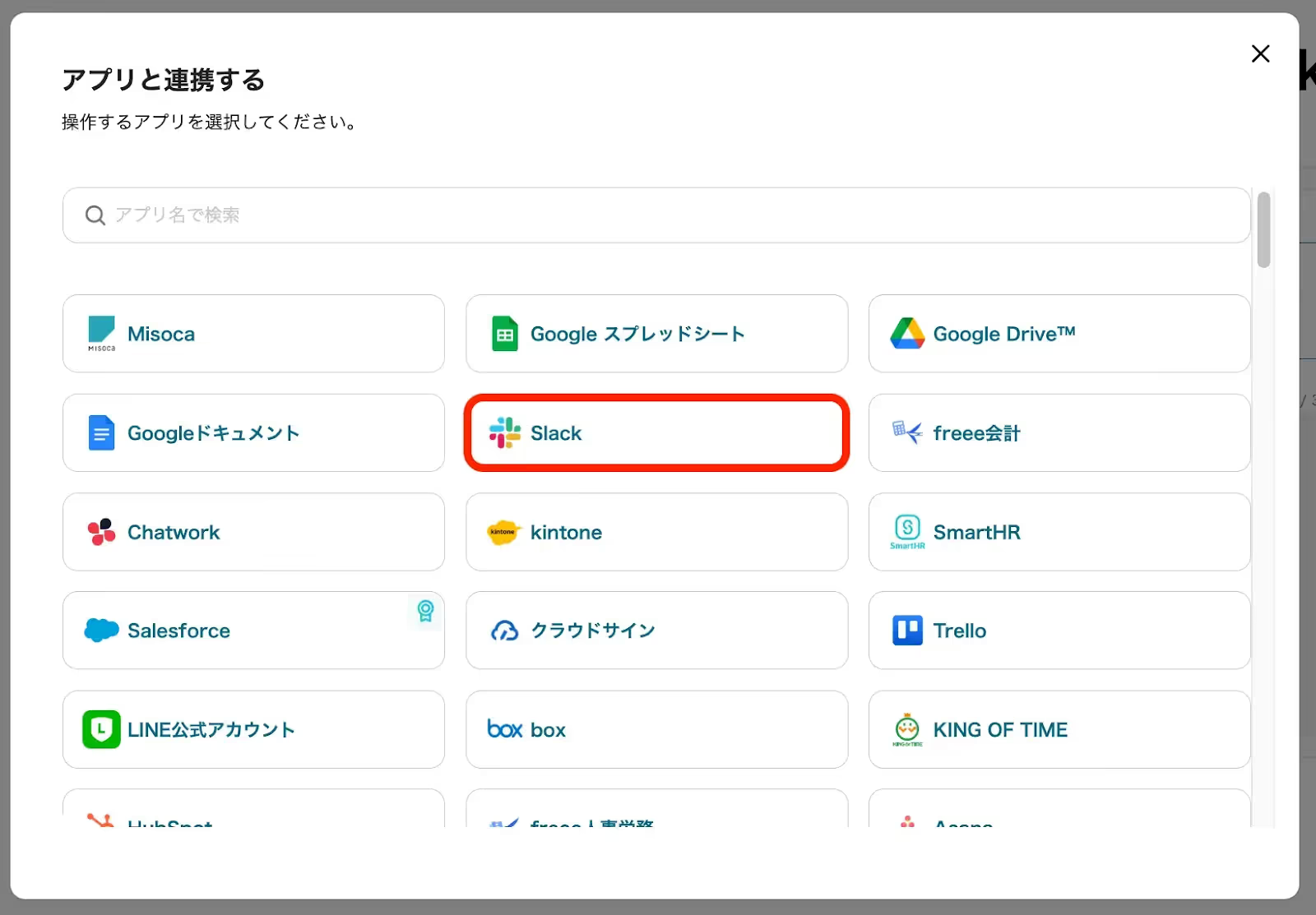 Slack、KING OF TIME、Google スプレッドシートのそれぞれとYoomを連携してください。 トリガーは5分、10分、15分、30分、60分の間隔で起動間隔を選択できます。 プランによって最短の起動間隔が異なりますので、ご注意ください。 オペレーション数が5つを越えるフローボットは、ミニプラン以上のプランで作成可能です。フリープランの場合はフローボットが起動しないため、ご注意ください。