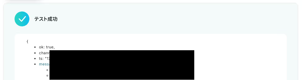 13.アウトプット(取得した値)に問題がなければ、『保存する』を押してください。(以下の画像では確認できませんが、取得した情報は各項目の横にグレー文字で表示されます。) つまり、ここで得た情報をSlackのメッセージ内容にそのまま反映可能となる、というわけです! ※取得した値 とは? トリガーやオペレーション設定時に、「テスト」を実行して取得した値のことを指します。 後続のオペレーション設定時の値として利用でき、フローボットを起動する度に変動した値となります。
