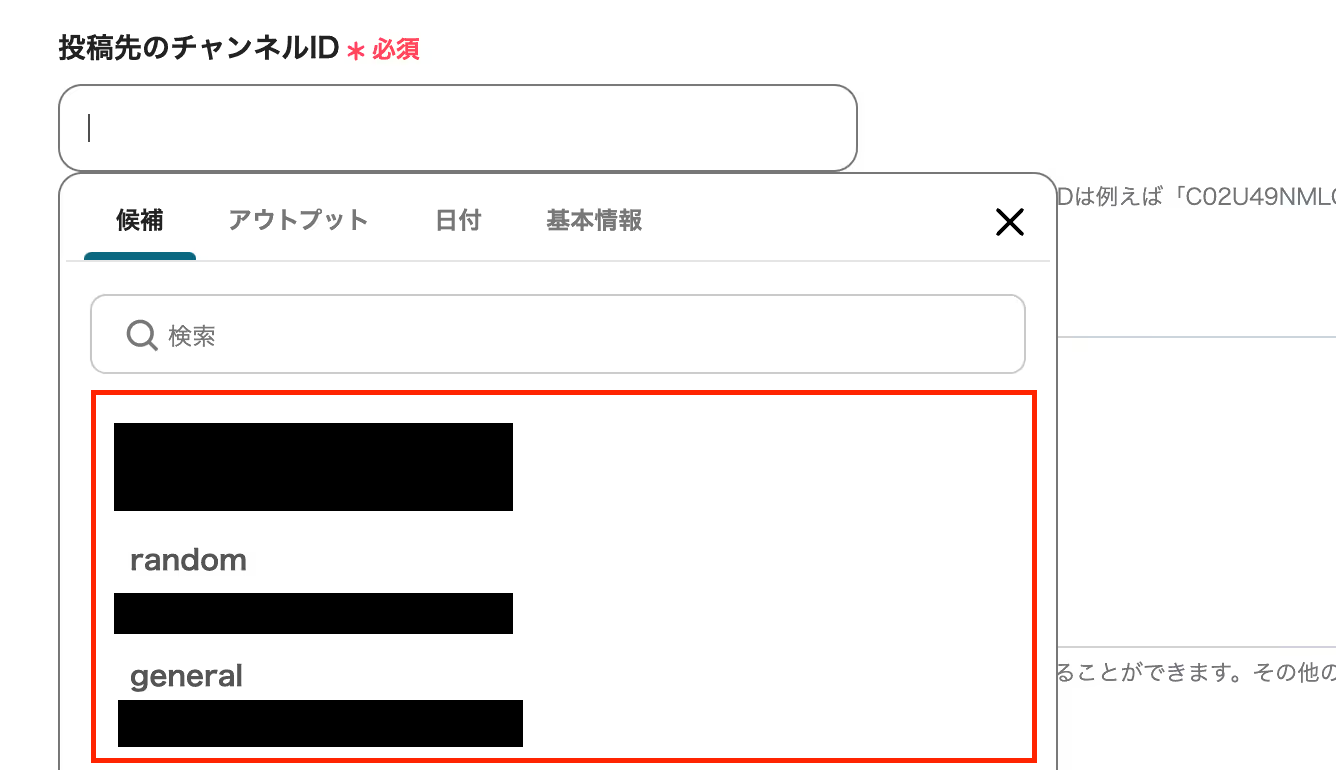 7.次の画面で「投稿先のチャンネルID」を指定します。 入力バーをクリックすると、連携したアカウントに基づいたチャンネルが『候補』に表示されます。 対象となるIDを選択してください。