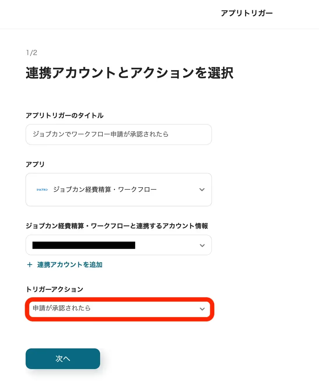 6.画面が切り替わるので、アプリトリガーのタイトルを設定してください。 7.ジョブカン経費精算・ワークフローと連携するアカウント情報が合っているかを確認します。 アカウント情報が表示されない場合は、+連携アカウントを追加をクリックして登録してください。 8.トリガーアクションは「申請が承認されたら」を選択してください。 9.ここまで設定できたら次へをクリックしましょう。