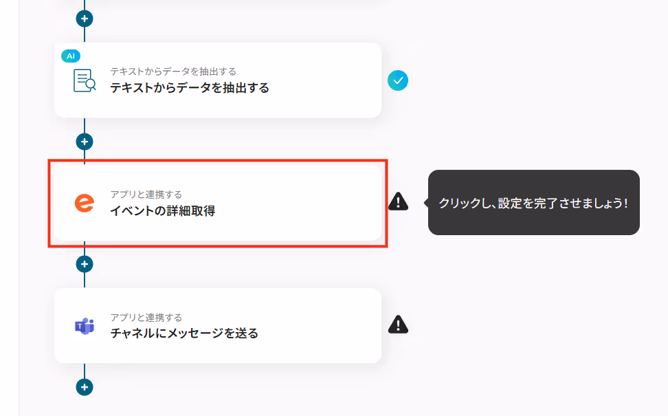 A:「チャネルにメッセージを送る」の下に繋がる「+」をクリックし、追加で自動化したい操作を選択してください。EventbriteやMicrosoft Teams以外のアプリのアクションも追加できます。