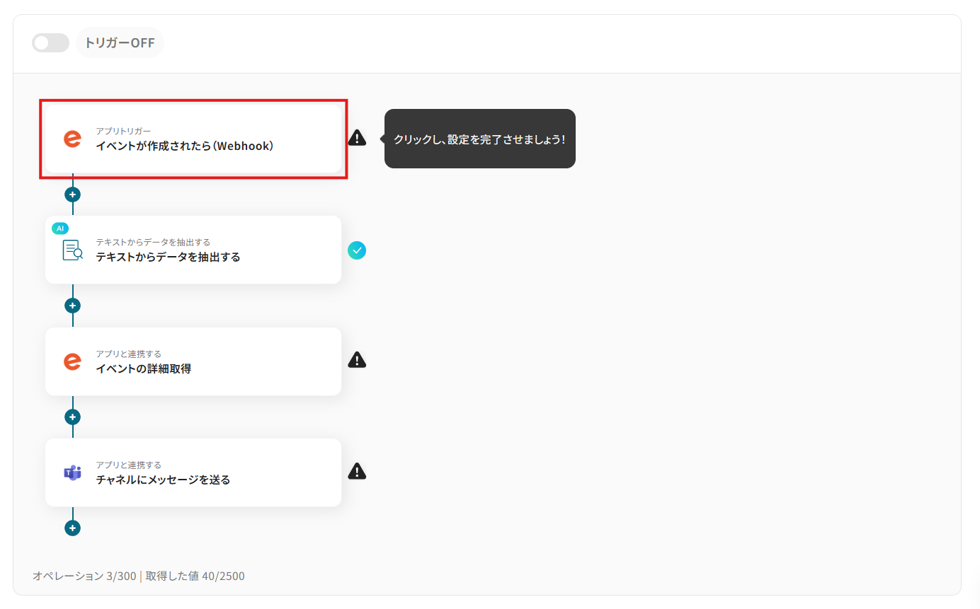 はじめに、EventbriteとMicrosoft TeamsをYoomと連携します。 次に、トリガーでEventbriteを選択し、「イベントが作成されたら」というアクションを設定します。 次に、オペレーションでAI機能を選択し、「テキスト抽出」のアクションを設定して必要な情報を取り出します。 その後、オペレーションでEventbriteの「イベントの詳細取得」アクションを設定し、より詳しい情報を取得します。 最後に、オペレーションでMicrosoft Teamsを選択し、「チャネルにメッセージを送る」アクションで、取得した情報を指定のチャンネルに通知します。 ※「トリガー」:フロー起動のきっかけとなるアクション、「オペレーション」:トリガー起動後、フロー内で処理を行うアクション
