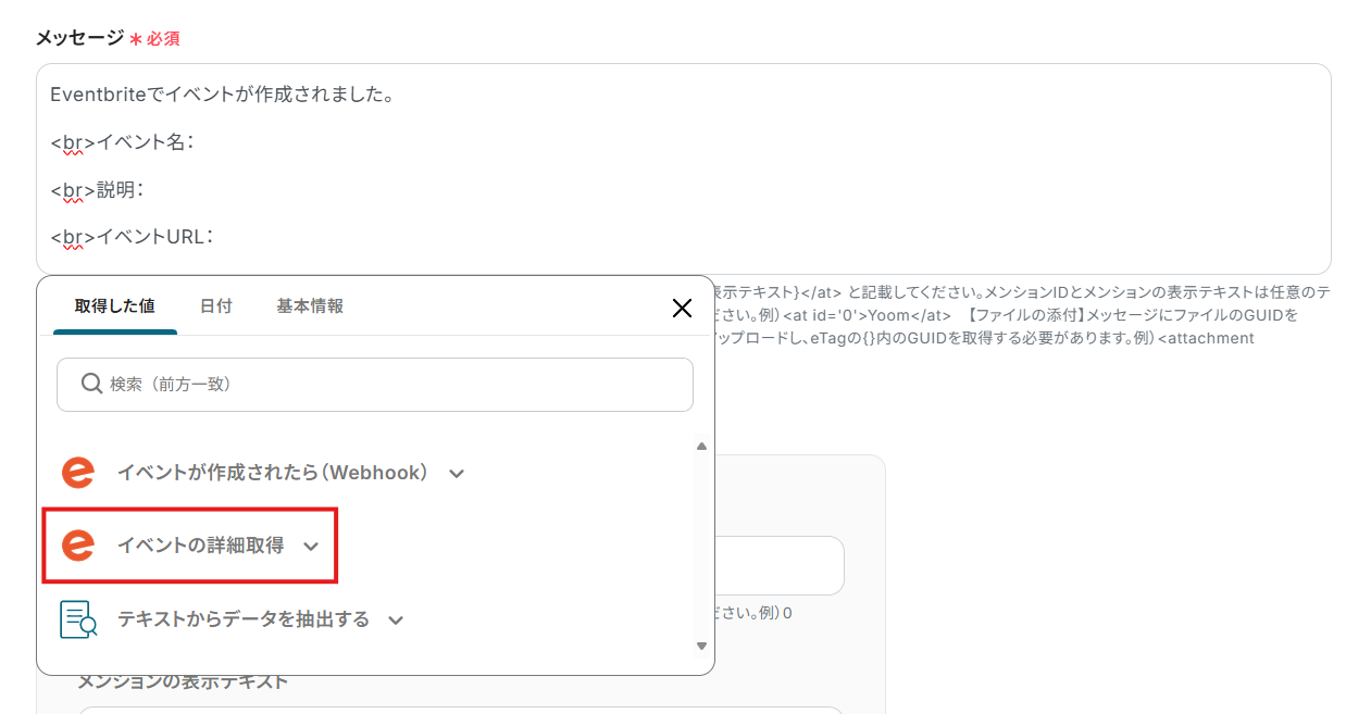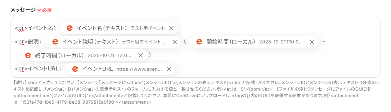 Slackへ通知するメッセージ内容は、自由にカスタマイズが可能です。 Eventbriteから取得したイベント名、開催日時、URLなどの情報を組み合わせて、チームにとって分かりやすい通知文面を作成してください。 ▪️注意事項